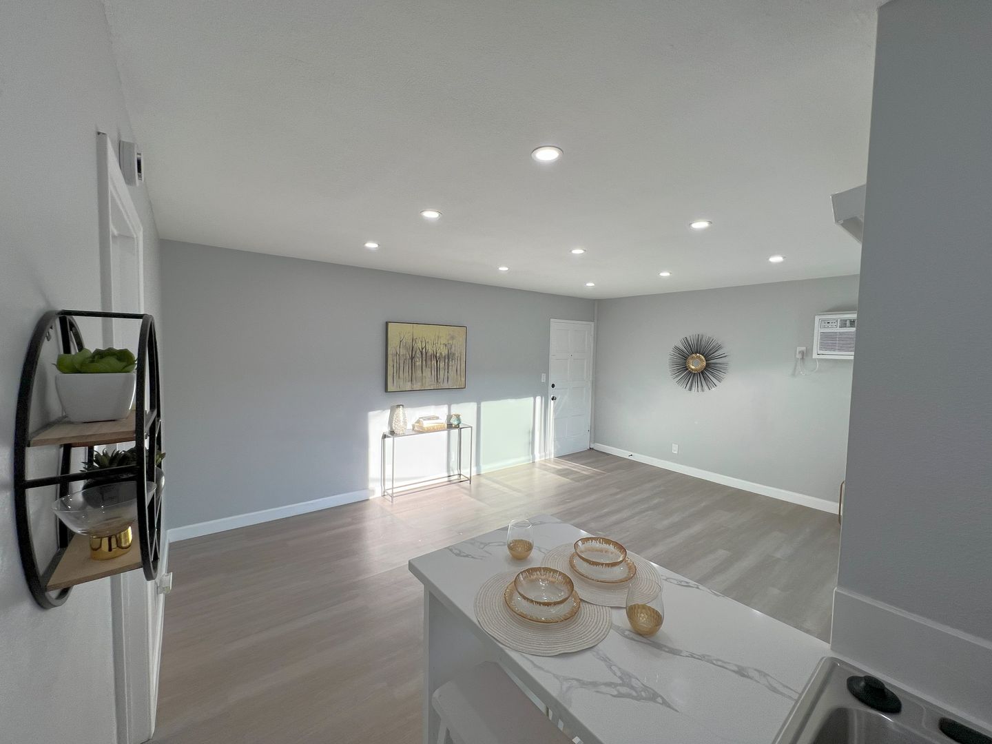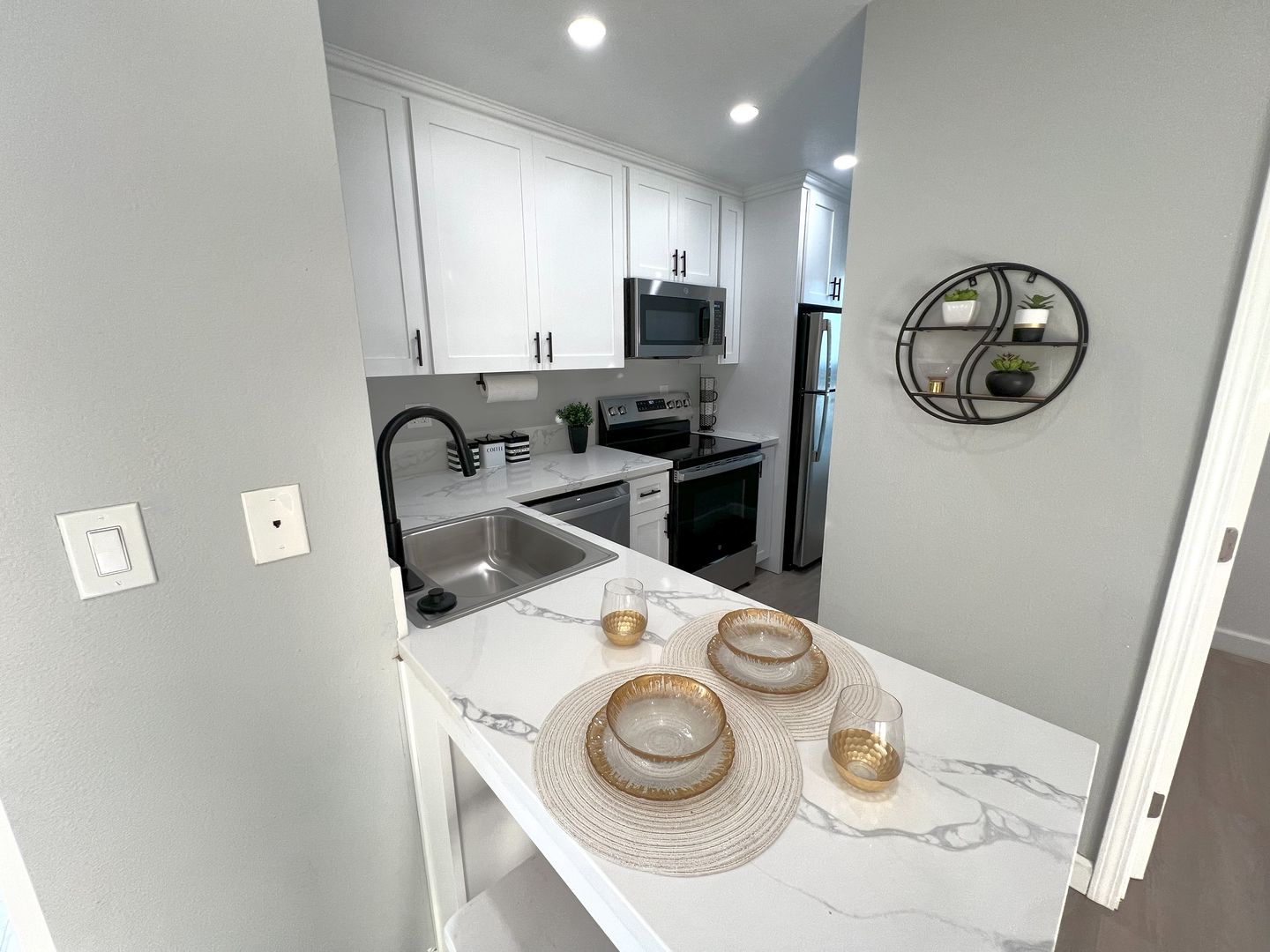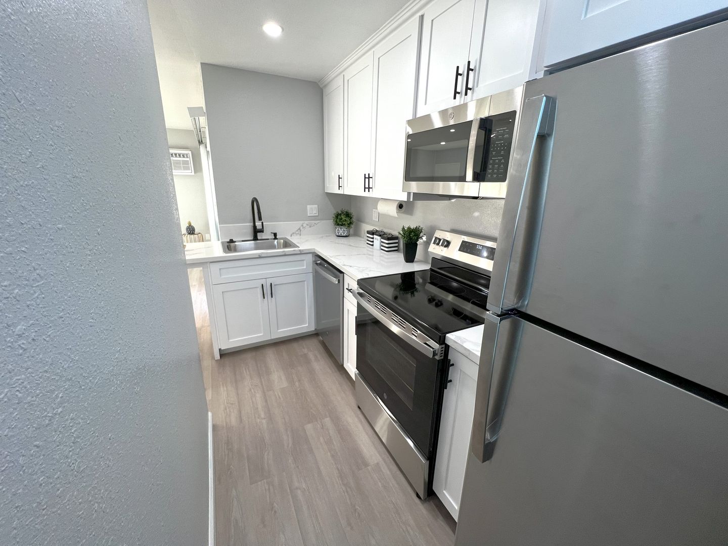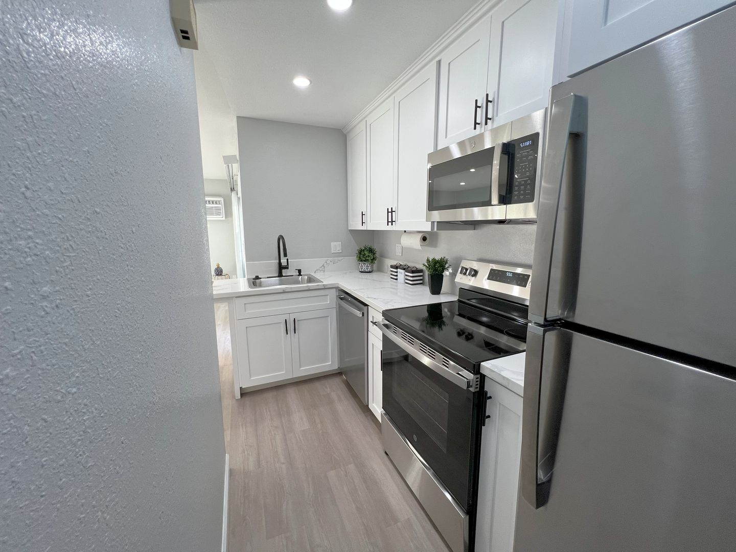 Welcome to Estrellita, a newly renovated studio apartment located in the heart of Los Alamitos. This apartment boasts a modern design with all new windows and blinds, new shaker cabinets, new interior doors, and new quartz countertops. The living room and kitchen are illuminated by new recessed lighting, creating a warm and inviting atmosphere. The kitchen is equipped with new stainless-steel appliances and a large sink with a garbage disposal. It also features a two-person bar nook, perfect for casual dining. The apartment has a large walk-in closet with a closet door, providing ample storage space. The bathroom is updated with new light fixtures and accessories. The apartment is cooled by air conditioning and has a patio off the living room, offering a private outdoor space. The hard surface flooring and baseboards throughout the apartment are all new, and the walls are freshly painted with a two-tone color scheme. The apartment complex offers on-site management and a laundry facility for added convenience. Plus, it's located in the Blue Ribbon Los Alamitos School District. Experience the comfort and convenience of living at Estrellita.